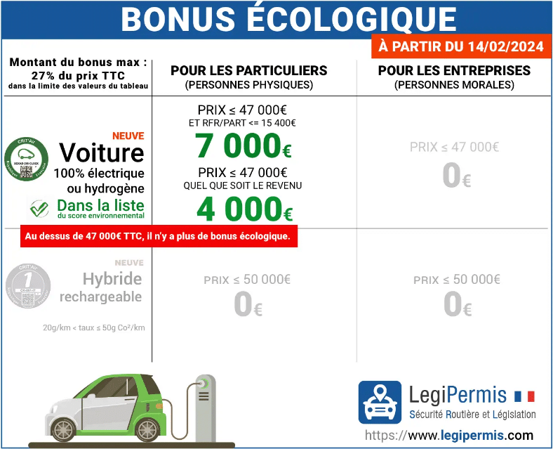 E’ un aiuto, per tutti gli individui in Francia, ad acquistare o noleggiare un nuovo veicolo elettrico e/o a idrogeno. L’importo del bonus arriva fino a 7.000 euro per una nuova auto privata. Il suo importo esatto dipende dal prezzo del veicolo e dal reddito del richiedente.