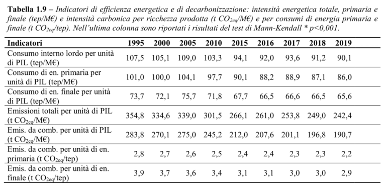 Nel periodo 1995-2019 il consumo interno lordo di energia per unità di PIL passa da 107,5 tep/M€ a 90,1 tep/M€, con una riduzione del 16,2%.