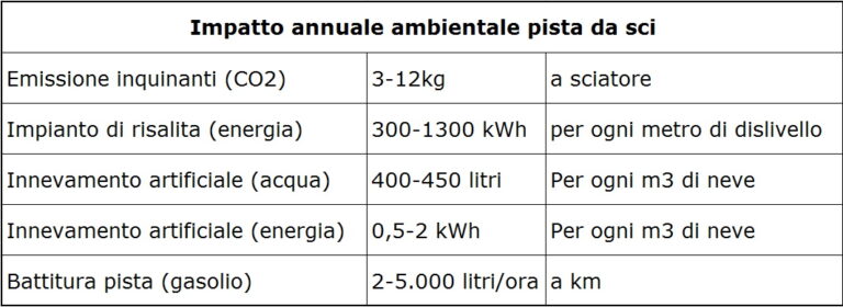 Una stazione con 50 km di piste utilizza 200.000 m3 di acqua all’anno e consuma 500 MWh per la neve tecnica (pari al consumo di 250 famiglie).