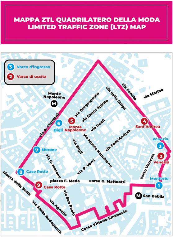 Si tratta di un’area in centro piuttosto ampia: Corso Matteotti Giacomo, Corso Monforte, Corso Venezia, Largo Mattioli Raffaele, Piazza Belgioioso, Piazza Della Scala, Piazza Meda Filippo, Piazza San Babila, Sito Dei Bagatti Valsecchi, Via Agnello, Via Bagutta, Via Bigli, Via Borgospesso, Via Case Rotte, Via Catena Adalberto, Via Degli Omenoni, Via Della Spiga – nel tratto compreso tra Via Borgospesso e Via Gesù, Via Gesu’, Via Hoepli Ulrico, Via Manzoni Alessandro, Via Monte Napoleone, Via Morone Gerolamo, Via Rossari Luigi, Via San Paolo, Via San Pietro All’Orto, Via Sant’Andrea, Via Santo Spirito, Via